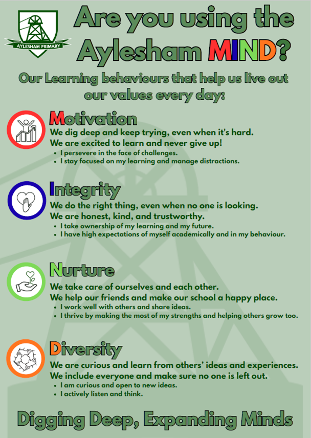 To help us achieve this, we follow the Aylesham MIND, a set of values and learning behaviours that guide how we learn, treat one another, and face challenges.